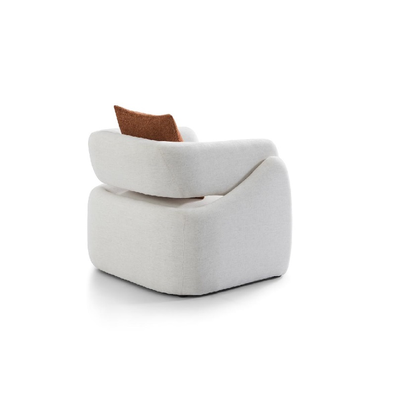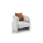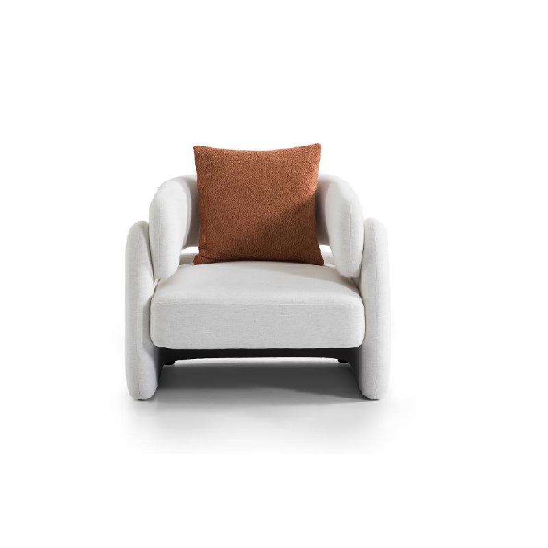 This modern art-style single-seater armchair features a geometric block 3D form as its core design language. Smooth curves delineate the integrated armrest and backrest, discarding the traditional chair legs and adopting a fully molded support base, giving it a minimalist yet sculptural visual appeal. The chair is covered in skin-friendly, breathable white fabric, paired with a red suede cushion as a contrasting decorative element. The soft texture and the bold lines achieve a clever balance, making it suitable for various interior styles such as modern minimalism and light luxury. It functions not only as a practical seat for the living room but also as an artistic piece within the space.