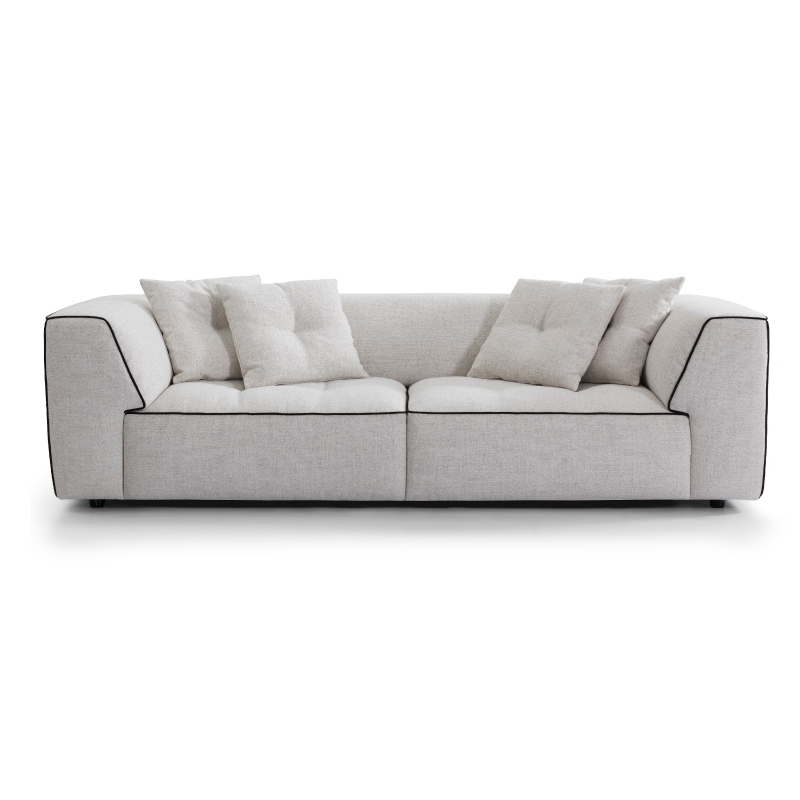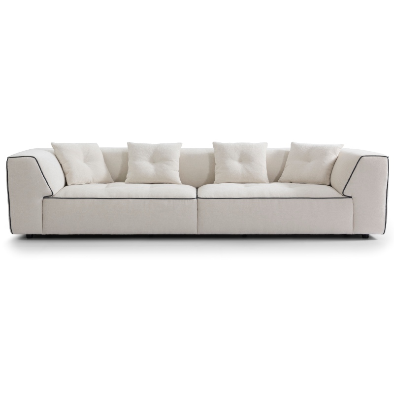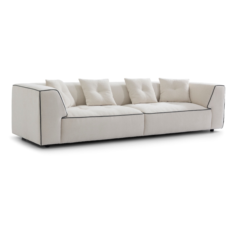 This cream white upholstered sofa is a striking fusion of modern architectural design and cloud-like comfort, reimagining the classic sofa with bold, intentional details. With its crisp geometric silhouette, eye-catching contrast piping, plush tufted cushions, and premium textured fabric, it delivers both head-turning style and exceptional everyday comfort, making it the ultimate statement piece for contemporary living spaces.