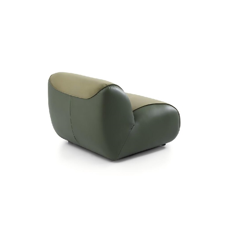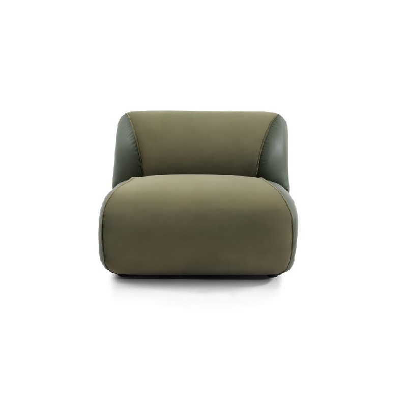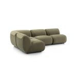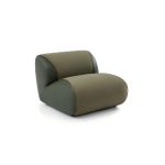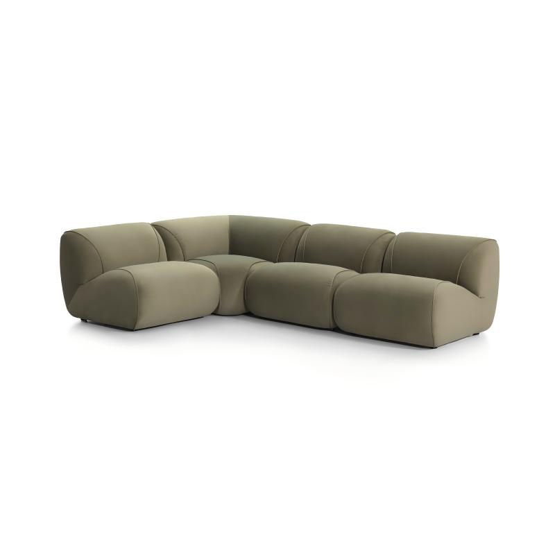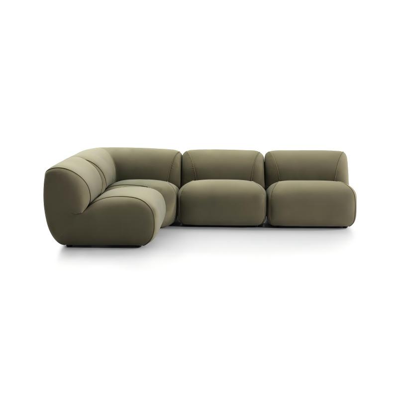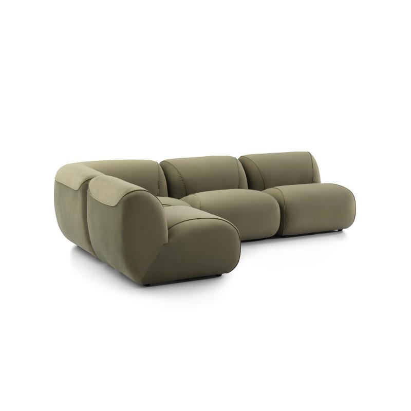 This modular sofa is filled with duck down, offering a soft seating experience and can be freely combined to suit different room layouts. It features streamlined, rounded contours, a uniform green fabric, and a sturdy structure, combining comfort and durability. Its modern design and neutral color make it a versatile addition to any interior, perfect for relaxation and socializing.