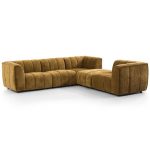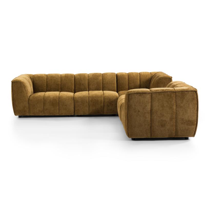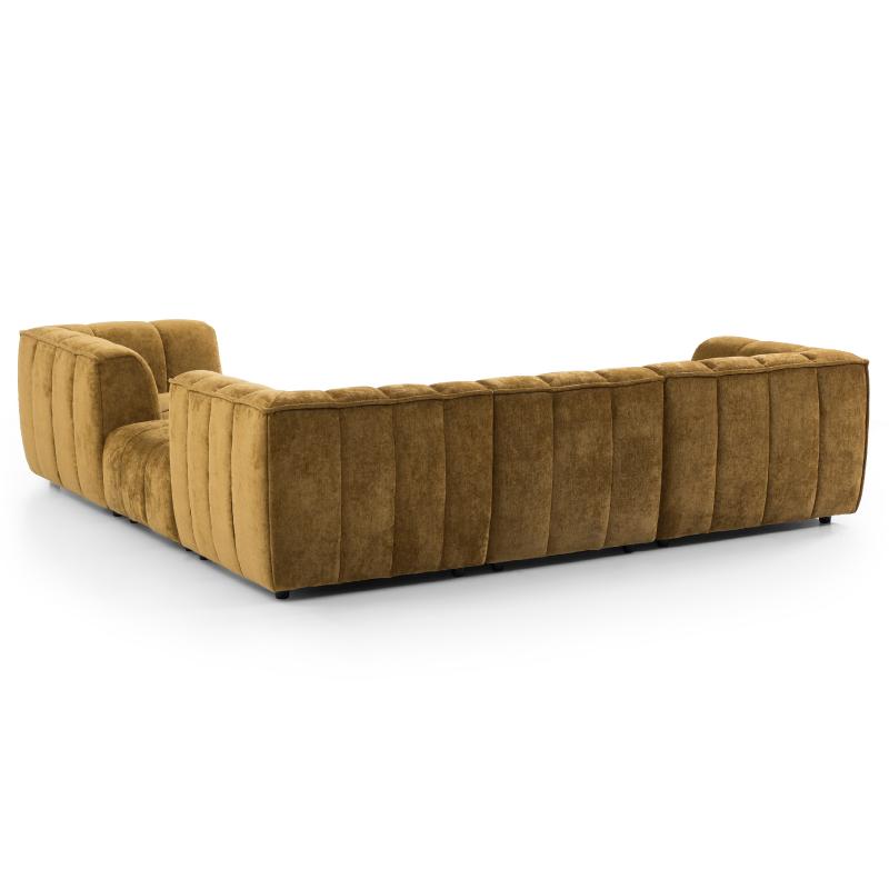 This L-shaped modular sectional sofa is upholstered in caramel suede fabric with a soft and delicate touch, and the three-dimensional vertical quilting process adds a sense of layering and design to the whole.