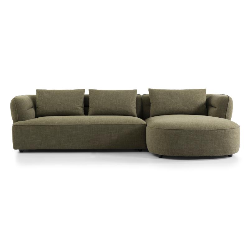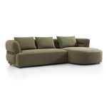 This olive green fabric L-shaped sofa features a right curved chaise lounge design for an immersive leisure experience. The seat cushions are filled with a triple combination of down, sponge and PP cotton, offering a cloud-like soft sitting feel without sagging easily. The back cushions are filled with down + PP cotton, which can closely fit the curves of the shoulders, neck, waist and back when leaning, bringing a wrap-around relaxation.