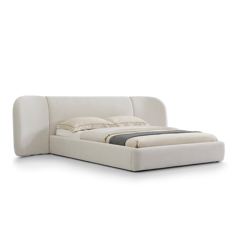 This ivory upholstered platform bed redefines bedroom luxury with its sculptural wingback design and cloud-like comfort, creating a serene sanctuary within your personal space. Defined by its expansive, enveloping headboard silhouette, durable textured upholstery, and streamlined low-profile frame, it delivers exceptional relaxation and timeless style, making it the ultimate centerpiece for a modern, healing bedroom.