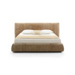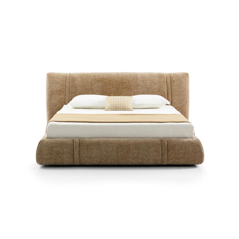 Introducing our luxurious modern bed, a seamless fusion of comfort and functionality to turn your bedroom into a haven of relaxation. Its standout feature is the generously padded, full-height headboard upholstered in a soft, warm light brown fabric, featuring subtle panel stitching that invites you to lean back and unwind.
